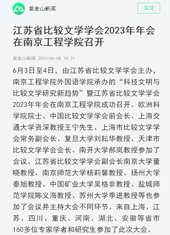 6月3日至4日,由江苏省比较文学学会主办,凯发k8官网外国语学院承办的“科技文明与比较文学研究新趋势”暨江苏省比较文学学会2023年年会在凯发k8官网成功召开。欧洲科学院院士、中国比较文学学会前会长、上海交通大学资深教授王宁先生、上海市比较文学学会常务副会长、复旦大学刘耘华教授、天津市比较文学学会会长、南开大学郝岚教授参加了会议。江苏省比较文学学会副会长南京大学董晓教授、南京师范大学杨莉馨教授、扬州大学秦旭教授、中国矿业大学吴格非教授、盐城师范学院陈义海教授、苏州大学季进教授等也参加了会议并主持大会不同环节。来自上海、江苏、四川、重庆、河南、湖北、安徽等省市160多位专家学者和研究生参加了此次大会。