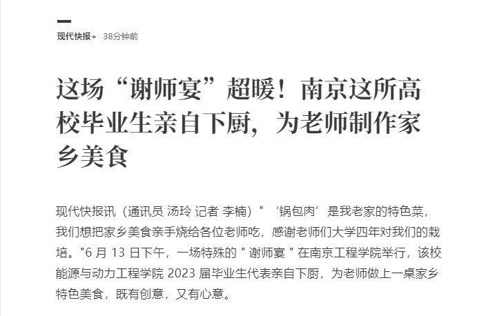 《现代快报》:这场“谢师宴”超暖!南京这所高校毕业生亲自下厨,为老师制作家乡美食